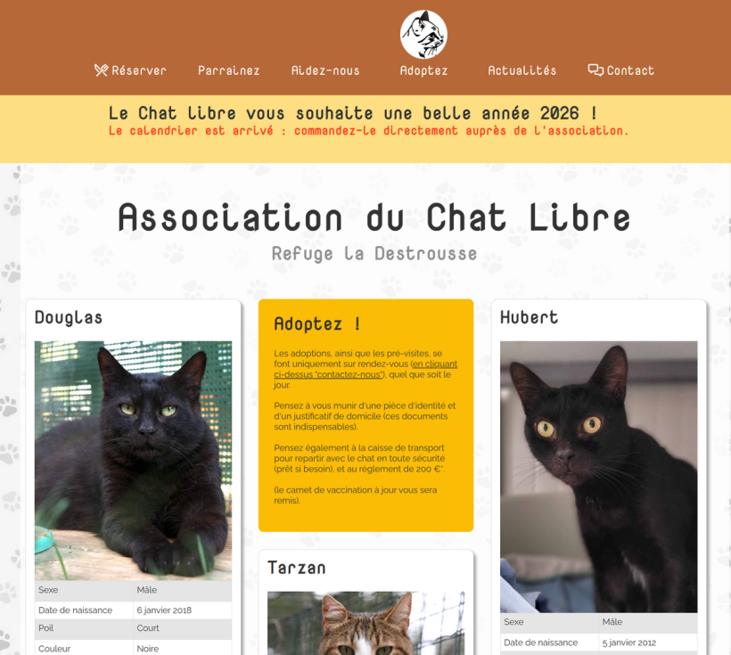 Site vitrine de l’Association du Chat Libre, refuge dédié à la protection et à l’adoption des chats abandonnés.